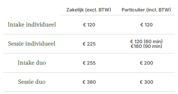 Alle genoemde investeringen zijn inclusief tijd voor voorbereiding, evaluatie en eventuele nazorg. Voor particulieren bied ik lagere tarieven om coaching toegankelijk te maken. Mocht je niet de financiële middelen hebben, neem dan alsnog contact op om te overleggen over mogelijkheden.